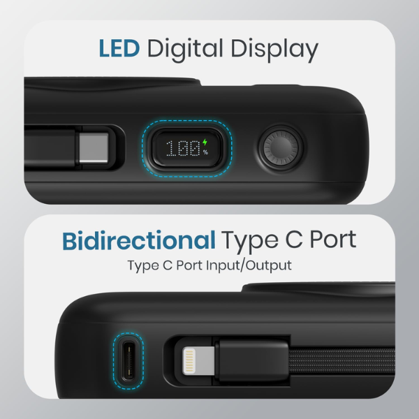 Magnetic Wireless Power Bank with Built-in Cable: Comes with a magnetic ring for secure wireless charging and an inbuilt Type-C cable, so you’re never caught without the right connector.